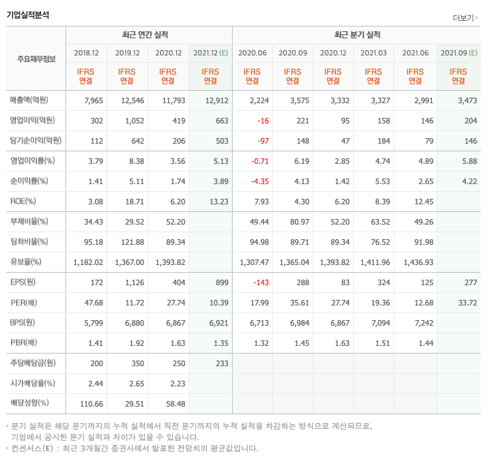 매출액 : 2018년 7965억원, 2019년 12,546억원으로 증가, 2020년 11,793억원으로 감소, 2021년 1,2분기 6318억원으로 전년동기대비 증가하였습니다. 2021년 2분기는 전년동기대비 29.3% 증가하였습니다. 2020년 분기별로 보면 3분기 3575억원, 4분기 3332억원, 2021년 1분기 3327억원, 2분기 2991억원입니다.