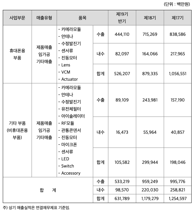 주식회사 파트론과 그 종속회사의 사업부문은 휴대폰용 부품과 통신시스템, 가전, 자동차 등에 채용되는 기타 부품, 악세서리(비휴대폰용)로 사업부문을 구분할 수 있습니다. 또한 해외생산법인인 연태파트론전자유한공사, PARTRON VINA는 대부분 지배회사의 임가공을 담당하고 있어 지배회사의 사업내용과 일치합니다. 사업부문별 매출액 및 매출비율은 다음과 같습니다.