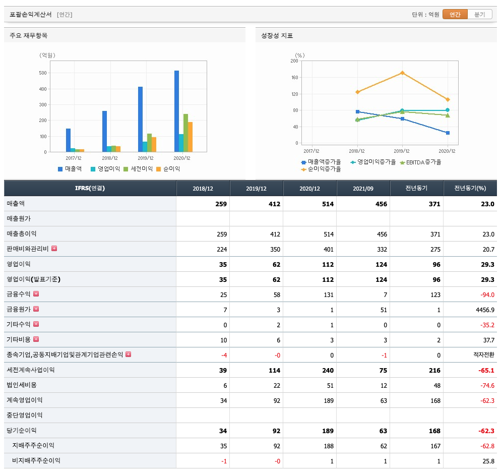 매출액 : 2018년 259억원, 2019년 412억원, 2020년 514억원, 2021년 1,2,3분기 456억원으로 전년동기대비 증가하였습니다. 2021년 3분기는 전년동기대비 23% 증가하였습니다. 2020년 분기별로 보면 4분기 143억원, 2021년 1분기 143억원, 2분기 155억원, 3분기 158억원입니다.
