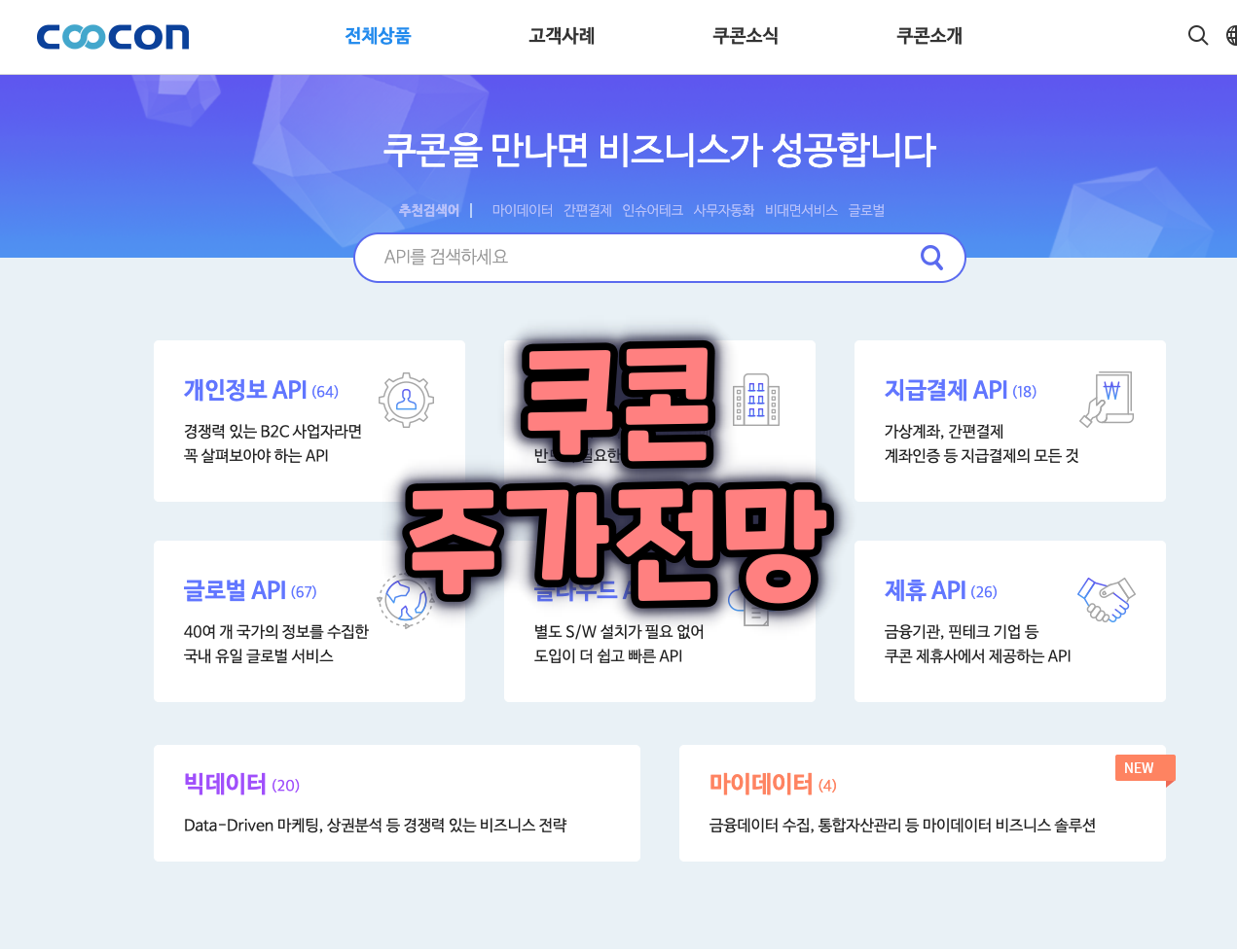 쿠콘은 50,000여 종의 비즈니스 데이터를 수집(Collect), 연결(Connect), 조직화(Control) 하여 기업 고객에게 제공하고 있습니다. 디지털 혁신 솔루션을 개발하는 1,600여 기업고객들이 API라는 표준화된 형태의 데이터를 공급받아 디지털 서비스를 구축하고 있습니다. 현재 쿠콘은 국내 500여 개, 해외 40여 국가 2,000여 기관으로부터 데이터를 수집·연결하고 있으며, 이 숫자는 디지털 혁신이 본격화되면서 점점 더 늘어날 것으로 예상됩니다. 쿠콘이 수집ㆍ연결하는 데이터는 약 220개의 API 상품으로 개발하여 국내 최대 정보 API 플랫폼인 「쿠콘닷넷」(www.coocon.net)을 통해 금융기관, 빅테크, 핀테크, 공공기관, 일반 기업 등 고객에게 제공하고 있습니다. 디지털 개인자산관리(PFM) 서비스, 개인 맞춤형 금융상품 추천 플랫폼, 간편결제 서비스 등 각종 비대면 서비스를 구현하고자 하는 고객들이 쿠콘의 API 상품을 이용하여 디지털 혁신을 이루고 있습니다. 오픈뱅킹, 마이데이터 등 디지털 혁신을 위한 사회제도들이 하나씩 시행되고 있습니다. 이처럼 디지털 전환이 가속화될수록 쿠콘 API에 대한 수요는 폭발적으로 늘어날 것으로 전망됩니다.