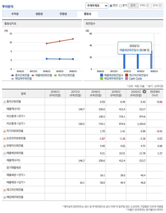 총자산회전율 : 2018년 약 719억원, 2019년 약 974억원, 2020년 약 1420억원이고, 회전율은 2018년 약 0.59%, 2019년 약 0.49%, 2020년 약 0.43%로 총자산회전율이 낮아지고 있습니다.