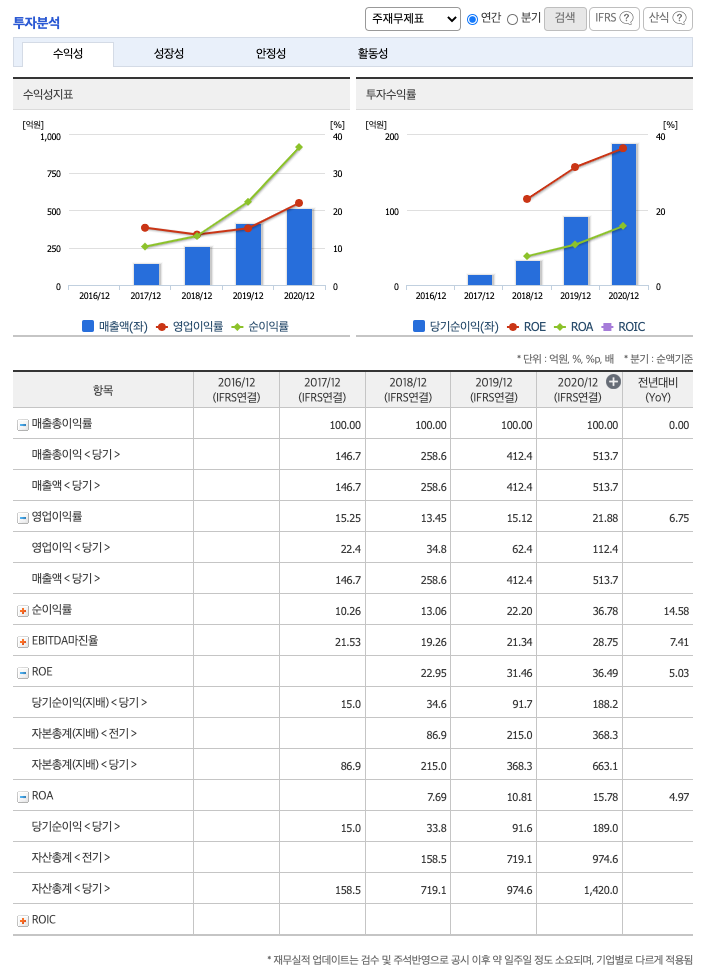 ROE(Return On Equity, 자기자본순이익율, 주주의 관점) : 2018년 약 22%, 2019년 약 31%, 2020년 약 36%이고, 자기자본순이익율은 이상율(10%)보다 높습니다.