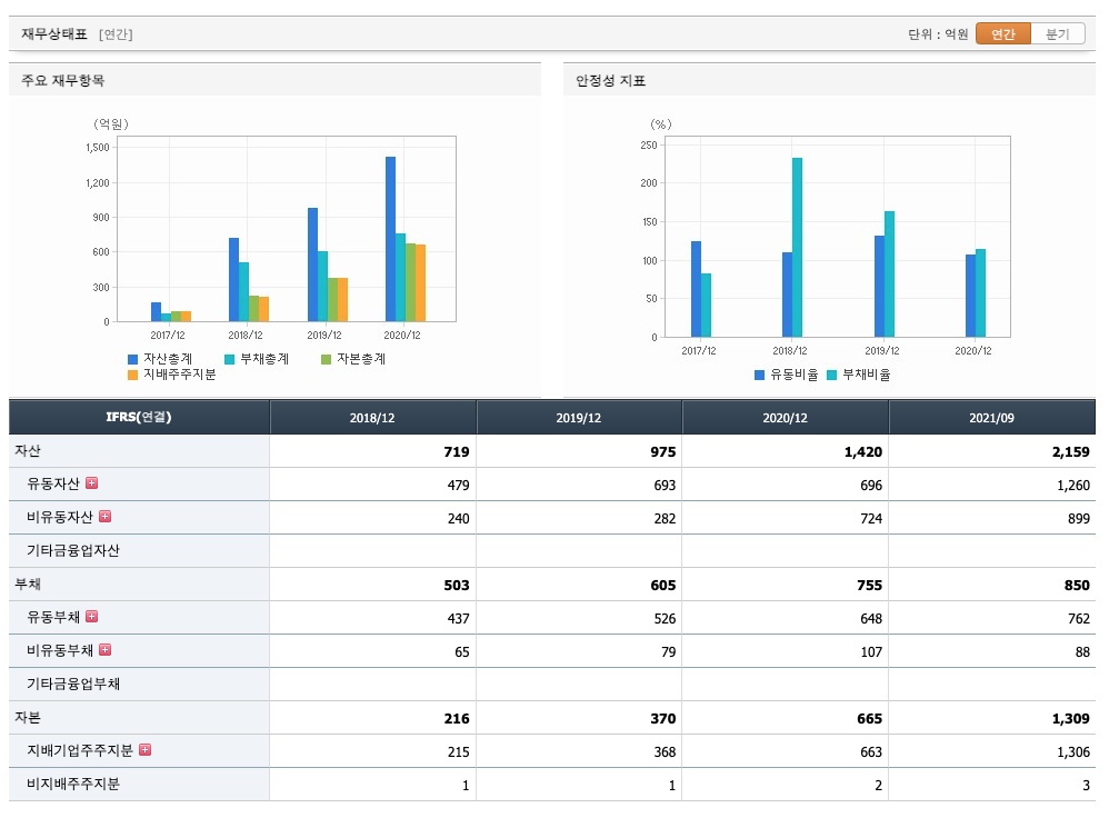 자산은 2018년 719억원, 2019년 975억원, 2020년 1420억원, 2021년 1,2,3분기 2159억원으로 증가 하였습니다.