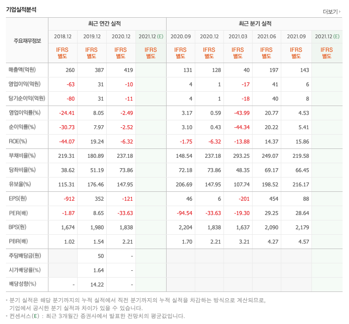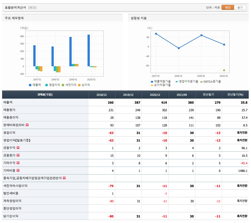 매출액 : 2018년 260억원, 2019년 387억원, 2020년 419억원, 2021년 1,2,3분기 380억원으로 전년동기대비 증가하였습니다. 2021년 3분기는 전년동기대비 35.8% 증가하였습니다. 2020년 분기별로 보면 4분기 140억원, 2021년 1분기 40억원, 2분기 197억원, 3분기 143억원입니다.