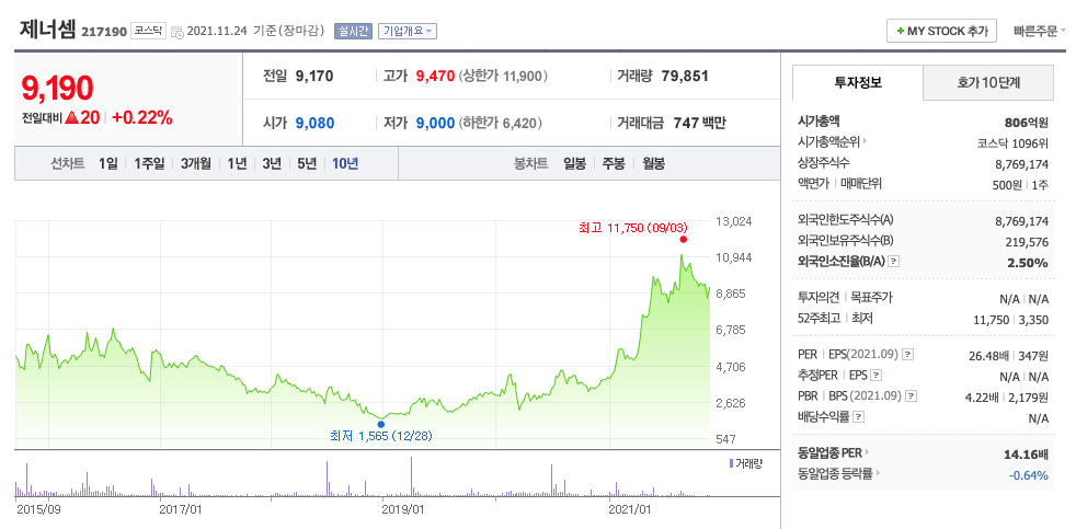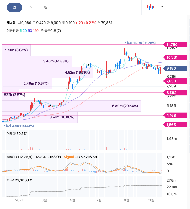 제너셈 주가는 21년 1월 급등하였고, 지속적으로 증가하여 21년 8월 최고 11,750원을 찍고 조정을 받았습니다.