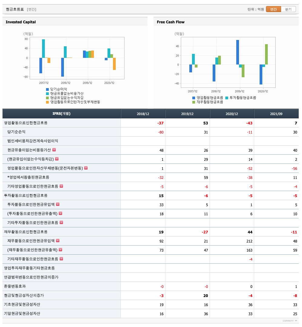 영업활동 현금흐름 : 2018년 -37억원, 2019년 53억원, 2020년 -43억원, 2021년 1,2,3분기 7억원으로 2019년과 2021년의 영업활동 현금흐름이 원활합니다.