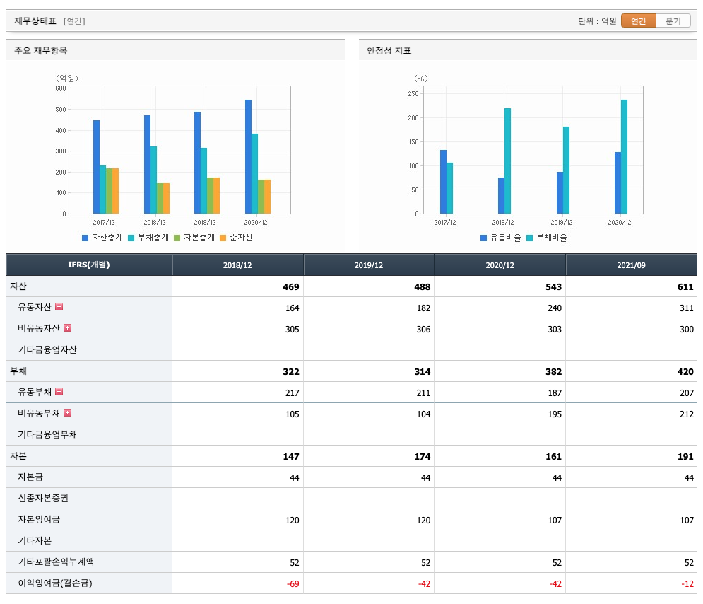 부채는 2018년 322억원, 2019년 314억원, 2020년 382억원, 2021년 1,2,3분기 420억원으로 증가 하였습니다.