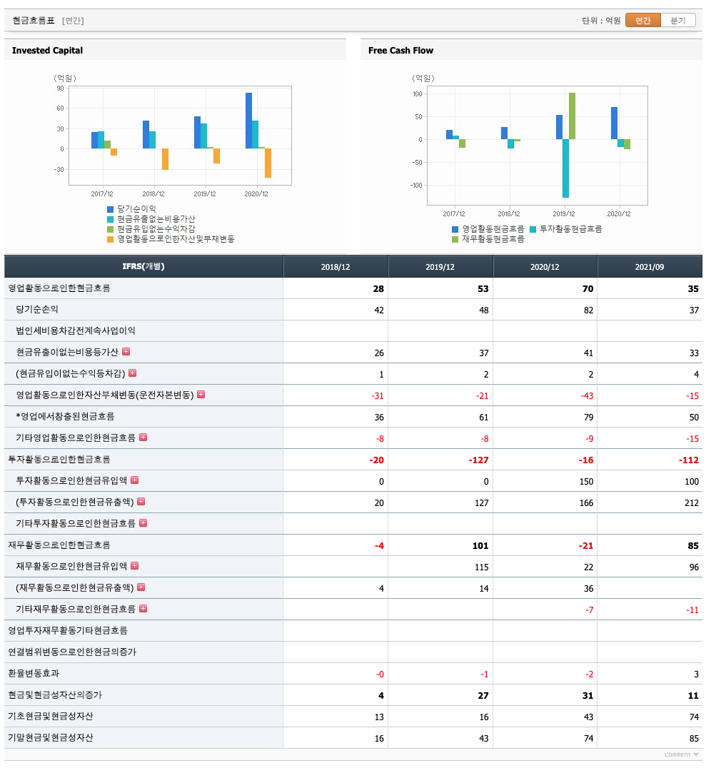 재무활동 현금흐름 : 2018년 -4억원, 2019년 101억원, 2020년 -21억원, 2021년 1,2,3분기 85억원으로 2018년과 2020년의 재무활동 현금흐름은 마이너스, 2019년과 2021년 3분기의 재무활동 현금흐름이 플러스입니다.