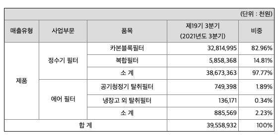 당사는 정수기 필터 제조 및 판매 등을 주 영업목적으로 2003년 11월 26일에 설립되었으며, 모든 정수기에 필수적으로 적용되고 있는 카본블록필터를 제조하는 전문업체로서, 주요 제품으로는 카본블록필터와 복합필터 등이 있습니다. 당사는 2017년 하반기부터 자동 생산라인을 구축하기 위해 설비투자를 진행하였으며, 2021년 3분기말 현재 6개의 반자동 생산라인 및 4개의 자동 생산라인을 보유하고 있습니다. 자동 라인은 기존의 반자동 라인에 비해 필터 단위당 생산시간이 축소되고 24시간 가동이 가능하여, 라인 운용 인력이 축소되고 원재료 Loss의 감소 등으로 생산능력 증가와 동시에 인건비 절감을 가능케 합니다. 당사는 국내 주요 정수기 제조사인 코웨이, LG전자, SK매직, 교원, 쿠쿠홈시스, 삼성전자 등에 필터를 공급하고 있으며, 공시서류 작성기준일 현재 당사의 매출 비중은 전체 매출액 중 97%가 정수기 필터 매출로 이루어지고 있습니다.