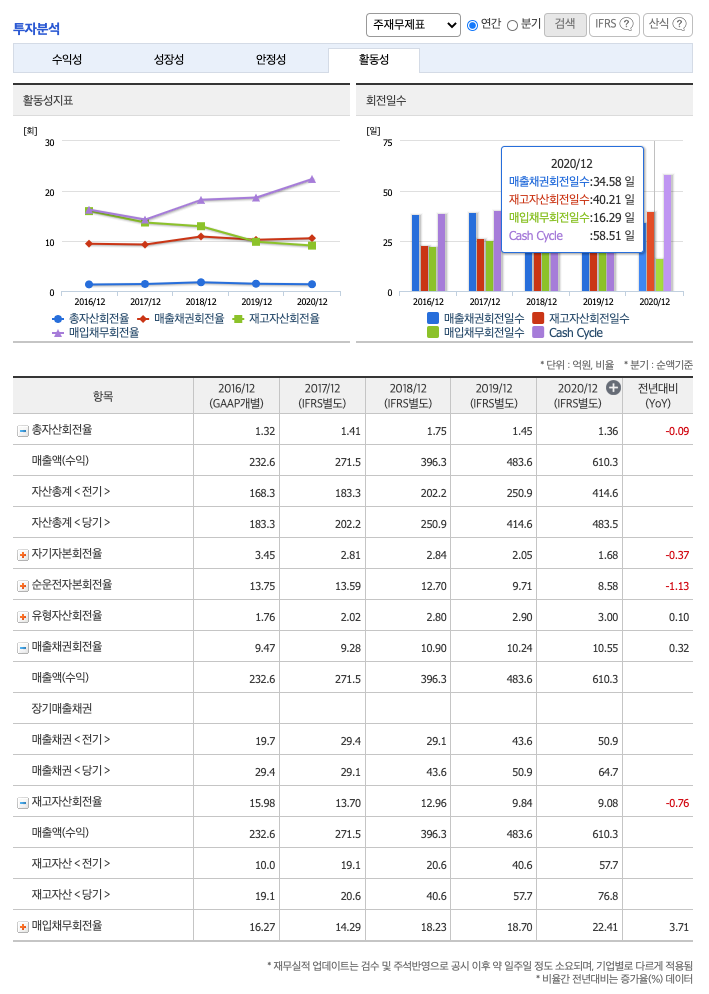 **매출채권회전일수(=돈을 받는 순환일 수, 낮을 수록 좋습니다) 약 34일, 재고자산회전일수(=재고자산 빠지는 일수, 높을 수록 좋습니다) 약 40일, 매입채무회전일수(=돈을 늦게 줘도 되는 일 수, 높을 수록 좋습니다) 약 16일이고, Cash Cycle(현금회전율, 낮을 수록 좋습니다) 약 58일로 현금운영이 안정적입니다.