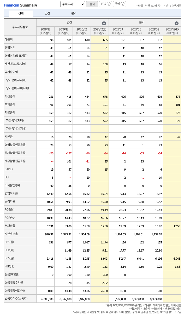 CAPEX(Capital expenditures,자본적 지출,미래의 이윤을 창출하기 위해 지출한 비용을 말함) : 2018년 19억원, 2019년 57억원, 2020년 50억원으로 CAPEX가 좋습니다. 2021년은 15억원으로 추정됩니다.