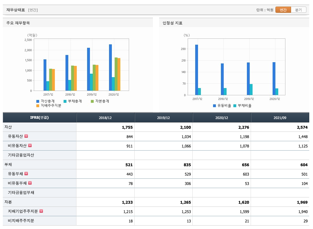 투자활동 현금흐름 : 2018년 억원, 2019년 억원, 2020년 억원, 2021년 1,2,3분기 억원으로 투자활동 현금흐름이 원활합니다.