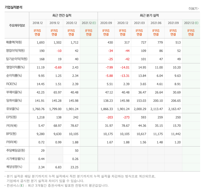 매출액 : 2018년 억원, 2019년 억원, 2020년 억원, 2021년 1,2,3분기 억원으로 전년동기대비 하였습니다. 2021년 3분기는 전년동기대비 % 하였습니다. 2020년 분기별로 보면 4분기 억원, 2021년 1분기 억원, 2분기 억원, 3분기 억원입니다.