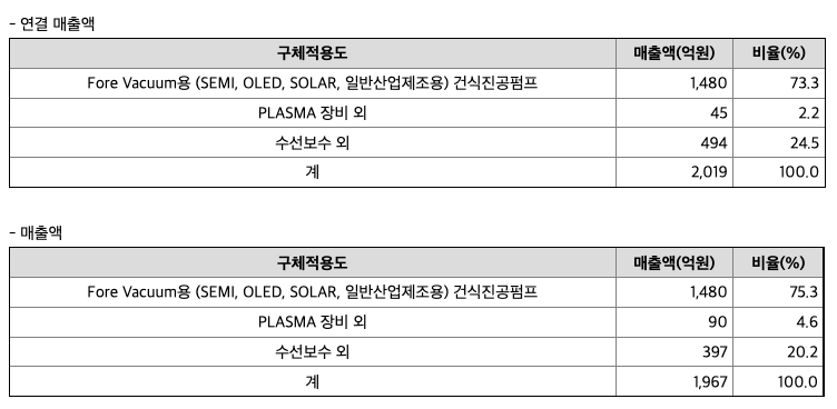 회사는 반도체, 디스플레이, 태양광셀 제조 등에 사용되는 Fore Vacuum용 건식진공펌프를 생산, 판매하고 있습니다. 제품 및 상품의 판매 후 A/S제품에 대하여는 수선보수매출이 발생하고 있습니다. 당분기말까지 총 매출액에서 제품, 상품, 수선보수매출 등이 차지하는 비율은 다음과 같습니다.