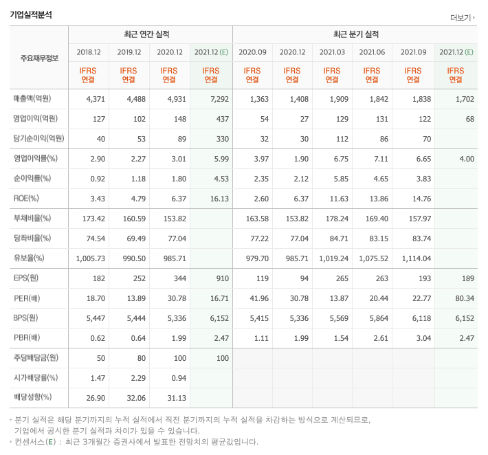 매출액 : 2018년 4371억원, 2019년 4488억원, 2020년 4931억원, 2021년 1,2,3분기 5589억원으로 전년동기대비 증가하였습니다. 2021년 3분기는 전년동기대비 58.7% 증가하였습니다. 2020년 분기별로 보면 4분기 1408억원, 2021년 1분기 1909억원, 2분기 1842억원, 3분기 1838억원입니다.