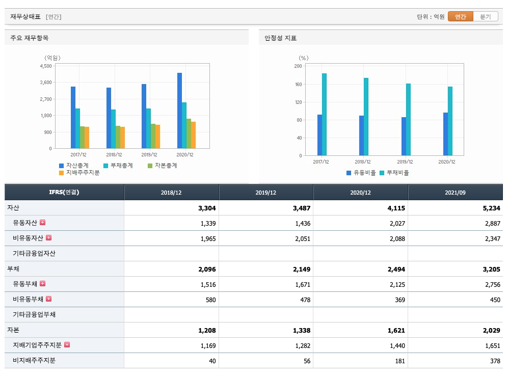 자산은 2018년 3304억원, 2019년 3487억원, 2020년 4115억원, 2021년 1,2,3분기 5234억원으로 증가 하였습니다.