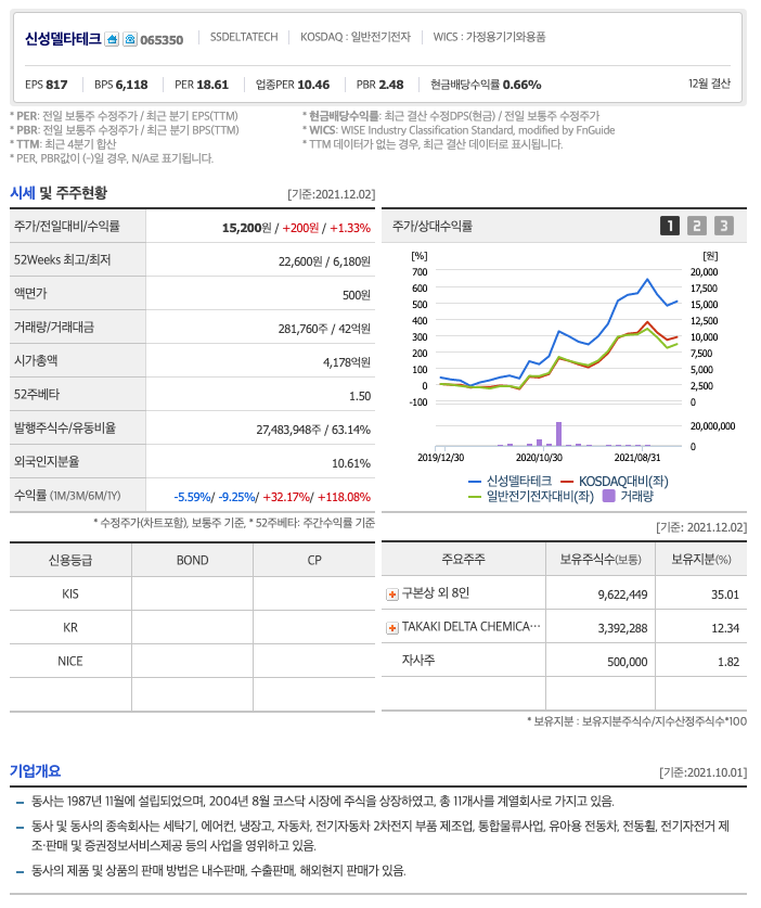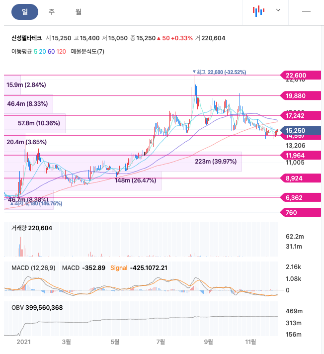신성델타테크의 주가는 20년 9월 급등하였고, 이후 계속 증가하여 21년 8월 최고 22,600원을 찍고 조정을 받고 있습니다.