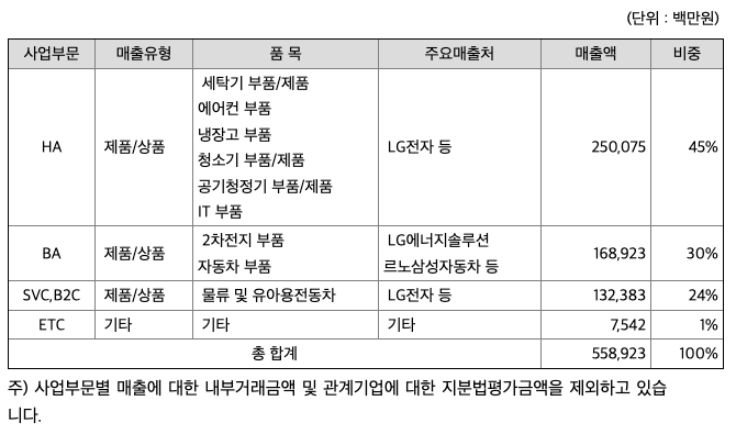 당사는 사업부문 구분을 계속성 등을 고려하여 경영의 다각화 실태를 적절히 반영할 수 있도록 HA(생활가전) 사업부문, BA(2차전지) 사업부문, SVC/B2C(물류 및 유아동 전동차) 사업부문으로 사업을 구분하고 있습니다. HA 사업부문은 가전제품 중 세탁기, 냉장고, 에어컨, 청소기, 공기청정기 등에 사용되는 부품 또는 제품을 생산하고 있으며 안정적인 시장을 형성하고 있습니다. BA 사업부문은 2차 전지산업 및 전기차, ESS(에너지 저장장치)에 탑재되는 중대형 전지 및 소형 리튬이온 전지를 생산하여 판매하는 사업으로, 정부의 환경 규제 등의 영향으로 앞으로의 성장 가능성이 높은 사업 부문입니다. SVC/B2C 사업부문은 재료나 제품 등의 운송ㆍ보관ㆍ하역 등과 이에 부가되어 가치를 창출하는 가공ㆍ조립ㆍ포장 등과 관련된 사업과 유아용 자동차 및 바디드라이어를 생산 및 판매하는 사업으로 구성되어 있습니다.