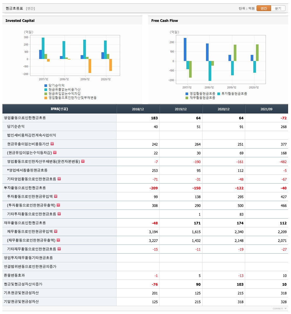 투자활동 현금흐름 : 2018년 -209억원, 2019년 -150억원, 2020년 -122억원, 2021년 1,2,3분기 -40억원으로 투자활동 현금흐름이 원활합니다.