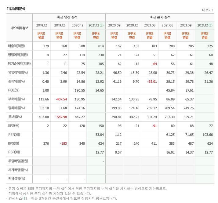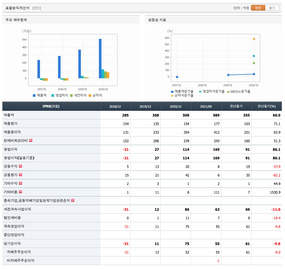 매출액 : 2018년 285억원, 2019년 368억원, 2020년 508억원, 2021년 1,2,3분기 589억원으로 전년동기대비 증가하였습니다. 2021년 3분기는 전년동기대비 66% 증가하였습니다. 2020년 분기별로 보면 4분기 153억원, 2021년 1분기 183억원, 2분기 200억원, 3분기 206억원입니다.