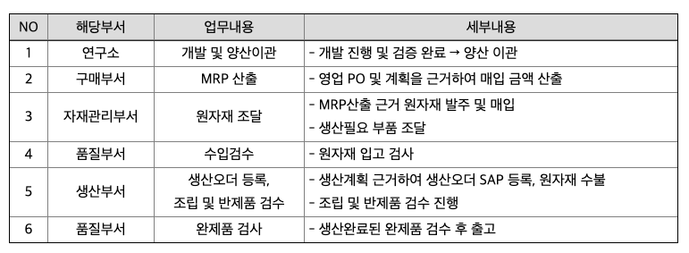 당사의 기본적인 제품 생산 방식은 연구소에서 제품의 개발을 진행하고, 검증완료 후에 구매 부서에서 제품의 설계도와 필요 부품을 구매하여 생산 부서로 전달하며, 조달된 부품과 설계도에 준하여 제품을 생산한 뒤 최종 품질관리 부서에서 검사를 함으로써 제품의 생산을 완료합니다. 업무의 세부 내용은 다음과 같습니다.