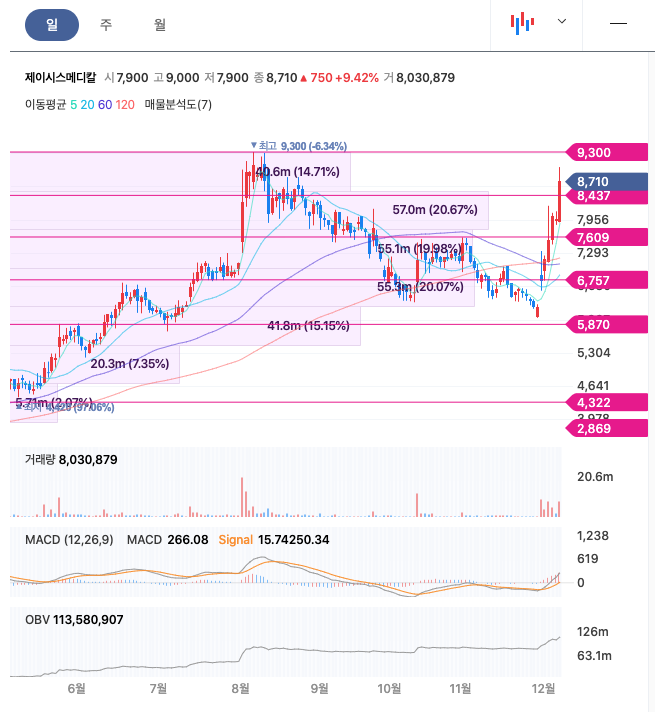 제이시스메디칼의 주가는 21년 4월에 급등하였고, 이후 증가하여 최고 21년 8월 9,300원을 찍고 조정을 받다가 급등하였습니다.