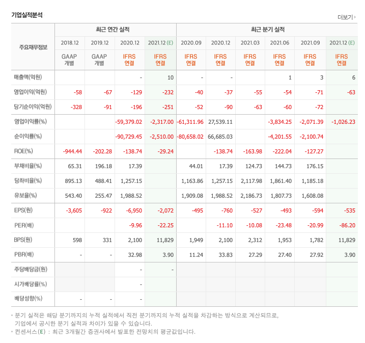 영업이익 : 2018년 -71억원, 2019년 -85억원, 2020년 -129억원, 2021년 1,2,3분기 -180억원으로 전년동기대비 적자지속하였습니다. 2020년 분기별로 보면 4분기 -37억원, 2021년 1분기 -55억원, 2분기 -54억원, 3분기 -71억원입니다.