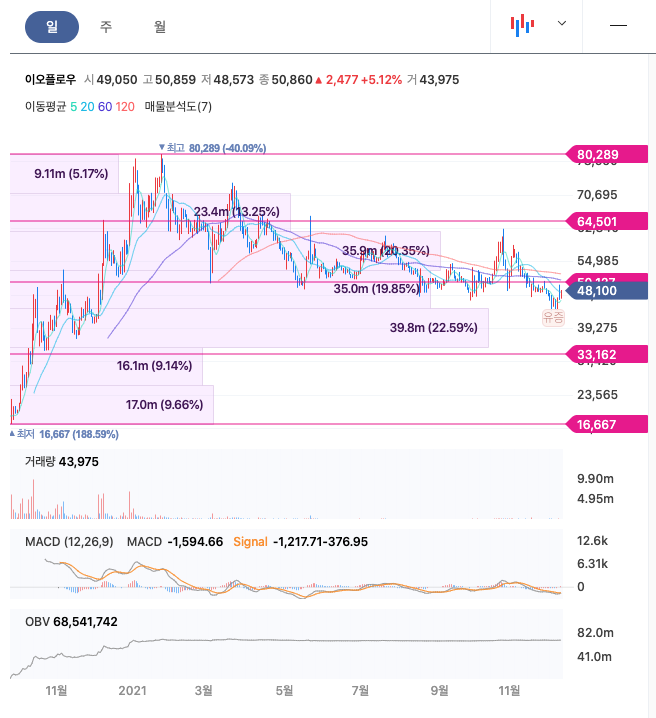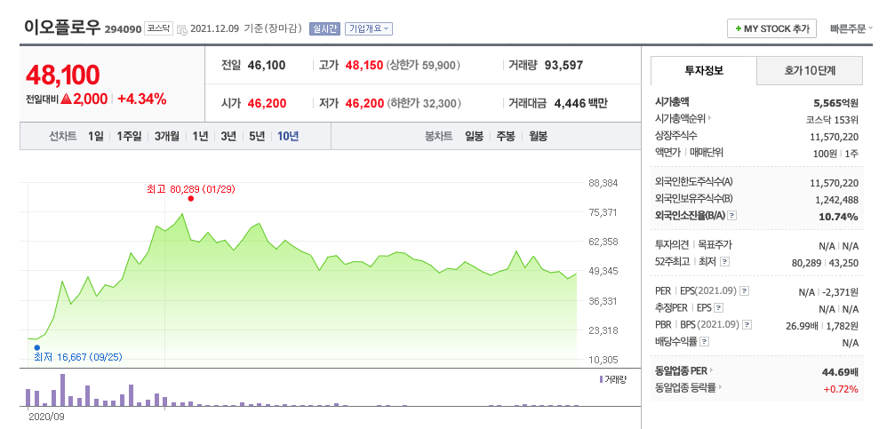 이오플로우의 주가는 20년 9월부터 증가하여 21년 1월 최고 80,289원을 찍고 조정을 받았습니다.