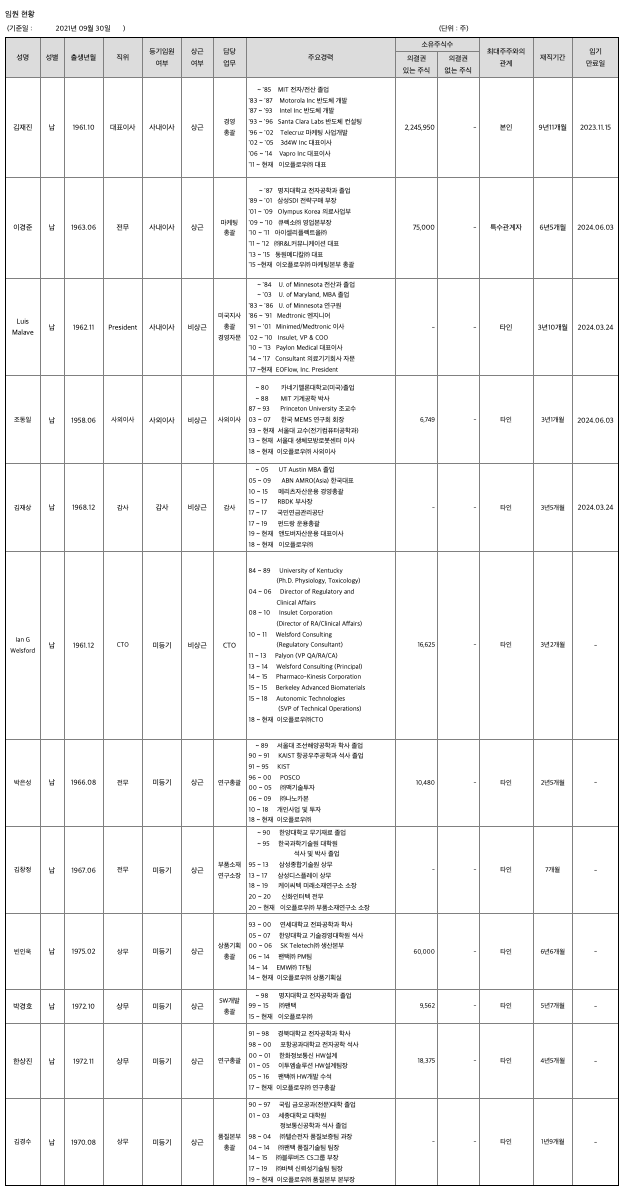 당사는 2011년 설립한 혁신적인 전기삼투펌프 기술 기반의 웨어러블 약물 전달 솔루션 전문기업입니다. 웨어러블 약물 주입기의 기술적 난제로 꼽혀온 구동부 기술을 '저전력형 고성능 전기삼투펌프 기술'을 적용하여 확보했습니다. 당사는 완치가 없고 평생 관리가 필요해 시장 규모가 크고 지속적으로 성장하고 있는 당뇨시장을 타깃해 웨어러블 인슐린 펌프 이오패치(EOPatch)를 2021년 본격 출시하였습니다. 이오패치는 웨어러블 형태의 일회용 인슐린 펌프로써 인슐린이 필요한 당뇨인들의 혈당 관리를 위해 인슐린을 지속해서 전달하는 데 사용되는 체외용 인슐린 주입기입니다. 펜이나 주사기를 사용하지 않고 피하지방이 많은 신체 부위에 부착해 사용하는 방식의 웨어러블 제품으로 현재 웨어러블 인슐린 펌프를 일회용으로 상용화한 기업은 미국 인슐렛(Insulet)사와 당사 뿐입니다. 당사와 인슐렛 이외의 다른 기업은 모두 구동부를 재활용하는 방식을 채택해 일회용 제품이 아니며, 사용자의 제품 조립이 필요하기 때문에 편의성 및 경제성이 낮은 것으로 알려져 있습니다. 당사의 제품은 인슐렛사 제품 대비 성능, 편의성, 가격 경쟁력 모두 갖춰 지난 16년간 웨어러블 인슐린 펌프 시장을 실질적으로 독점한 인슐렛사의 유일한 대항마로 평가받고 있습니다. 이오패치는 기존 인슐린 펌프보다 편의성이 개선됐습니다. 크기가 작고 가벼워 착용감이 좋을 뿐 아니라 인슐린 주입선이 없고 완전 방수 기능이 있어 샤워, 목욕, 수영, 운동등의 활동에도 제약이 없습니다. 교체주기도 3.5일로 길어 일주일에 2번, 특정 요일에만 교체하면 돼 훨씬 편리하게 사용할수 있습니다. 펌프 본체버튼을 이용하지 않고 별도의 컨트롤러(ADM) 또는 스마트폰 어플리케이션(나르샤)을 통해 인슐린 주입을 조절할 수 있어 시간과 공간의 제약이 없다는 것도 특징입니다. 나르샤는 세계 최초의 인슐린 주입이 가능한 웨어러블 인슐린 펌프의 스마트폰 앱입니다. 2021년 하반기 국내 런칭을 목표하고 있습니다. 당사는 이오패치를 통해 인슐린 투여가 필요한 당뇨인들의 저혈당 위험이 줄어들 뿐 아니라 편의성과 안전성이 대폭 향상될 것으로 기대하고 있습니다. 이오패치 제품은 2017년 국내 식약처 허가를 받아 2021년 4월 휴온스를 통해 국내 본격 판매를 시작하였고 2021년 반기 매출은 141백만원으로 집계되었습니다. 또한 2021년 5월 유럽 CE 인증을 받아 하반기 본격적인 유럽 런칭이 기대되고 있습니다. 차세대 제품으로는 연속혈당측정기(CGMS)와 연계하여 혈당값에 따라 자동으로 인슐린이 주입되는 분리형 및 일체형 웨어러블 인공췌장 제품을 개발 중에 있습니다. 또한 웨어러블 인공신장 개발 등 다양한 의료 분야로 포트폴리오를 지속 확대 중입니다