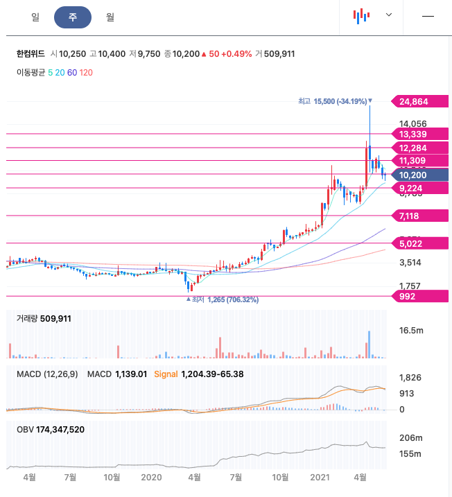 한컴위드는 21년 1월부터 주가가 급반등하여 상승과 보합을 유지하다가 21년 4월에 아로와나 토큰으로 최고점 15,500원을 찍고 조정을 받고 있습니다.