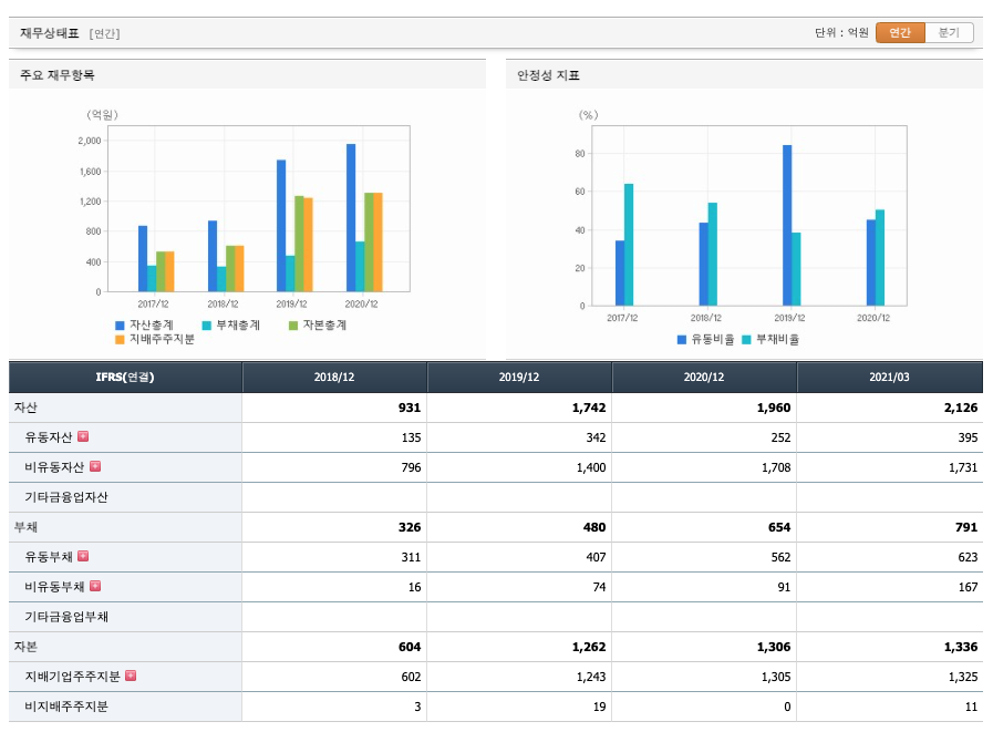 자산은 2018년 931억원, 2019년 1742억원, 2020년 1960억원, 2021년 1분기 2126억원으로 증가하였습니다.
