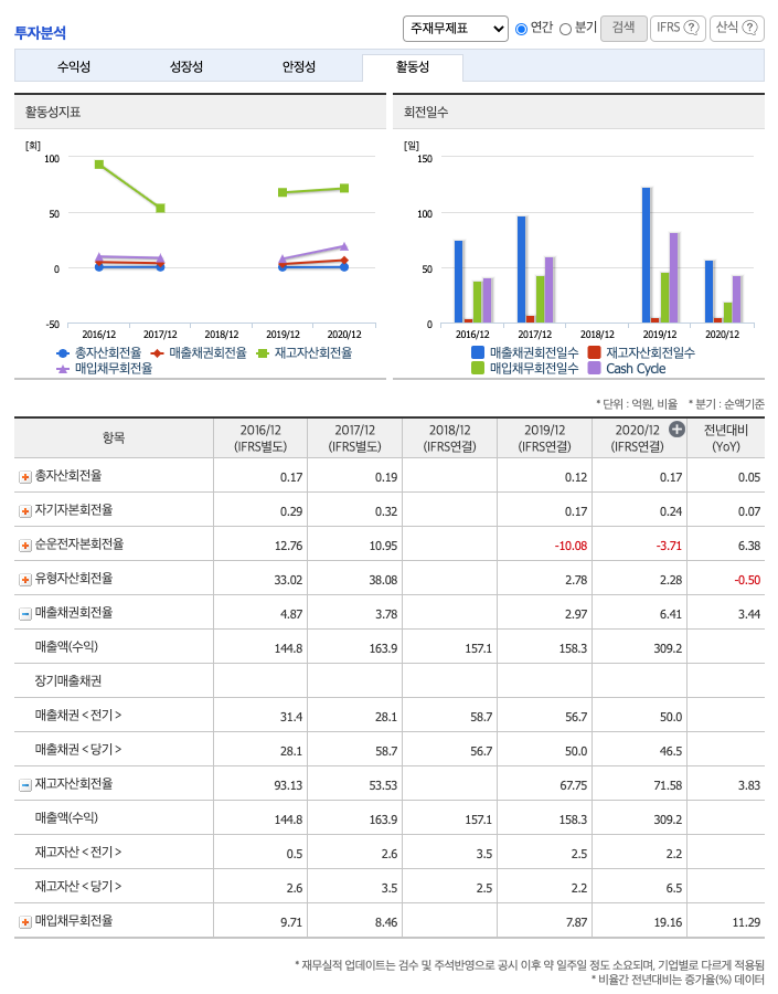 재고자산회전율 : 2018년 약 2억원, 2019년 약 2억원, 2020년 약 6억원이고, 회전율은 2019년 약 67회, 2020년 약 71회로 안정적입니다.