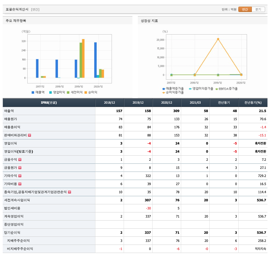 매출액 : 2018년 157억원, 2019년 158억원, 2020년 309억원, 2021년 1분기 58억원으로 증가하였습니다. 2021년 1분기는 전년동기대비 21.5% 증가하였습니다. 2020년 분기별로 보면 2분기 74억원, 3분기 83억원, 4분기 104억원입니다.
