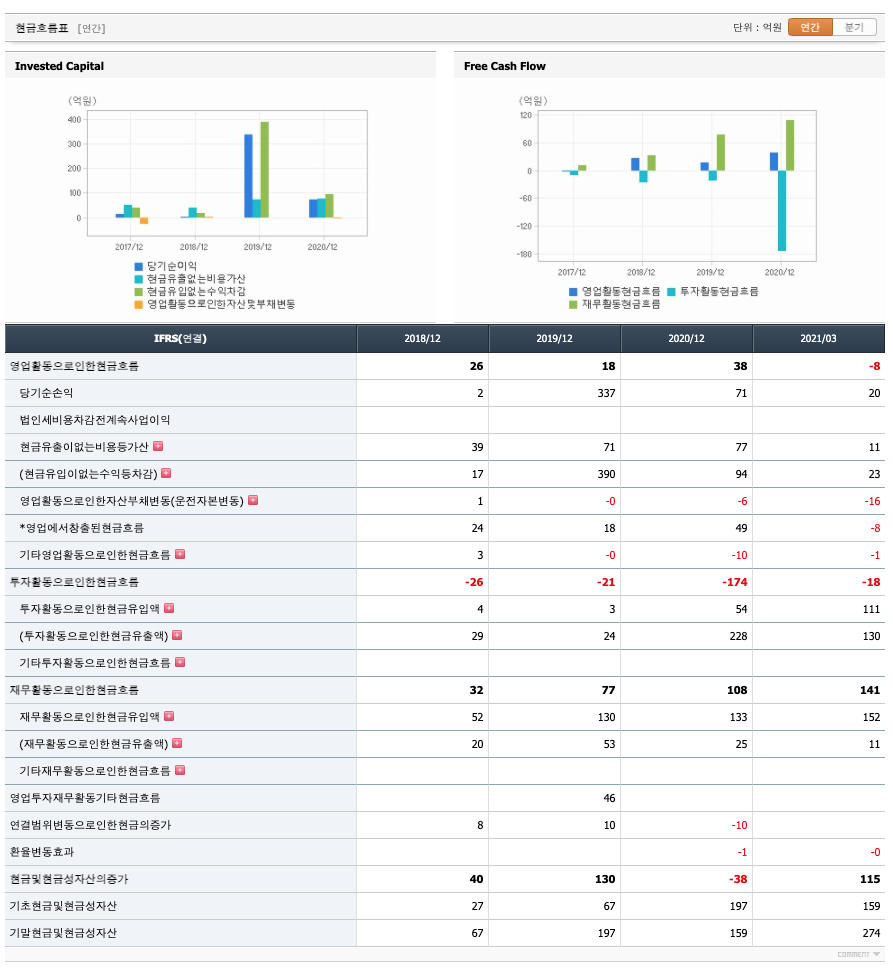 투자활동 현금흐름 : 2018년 -26억원, 2019년 -21억원, 2020년 -174억원, 2021년 1분기 -18억원으로 영업활동 현금흐름이 원활합니다.