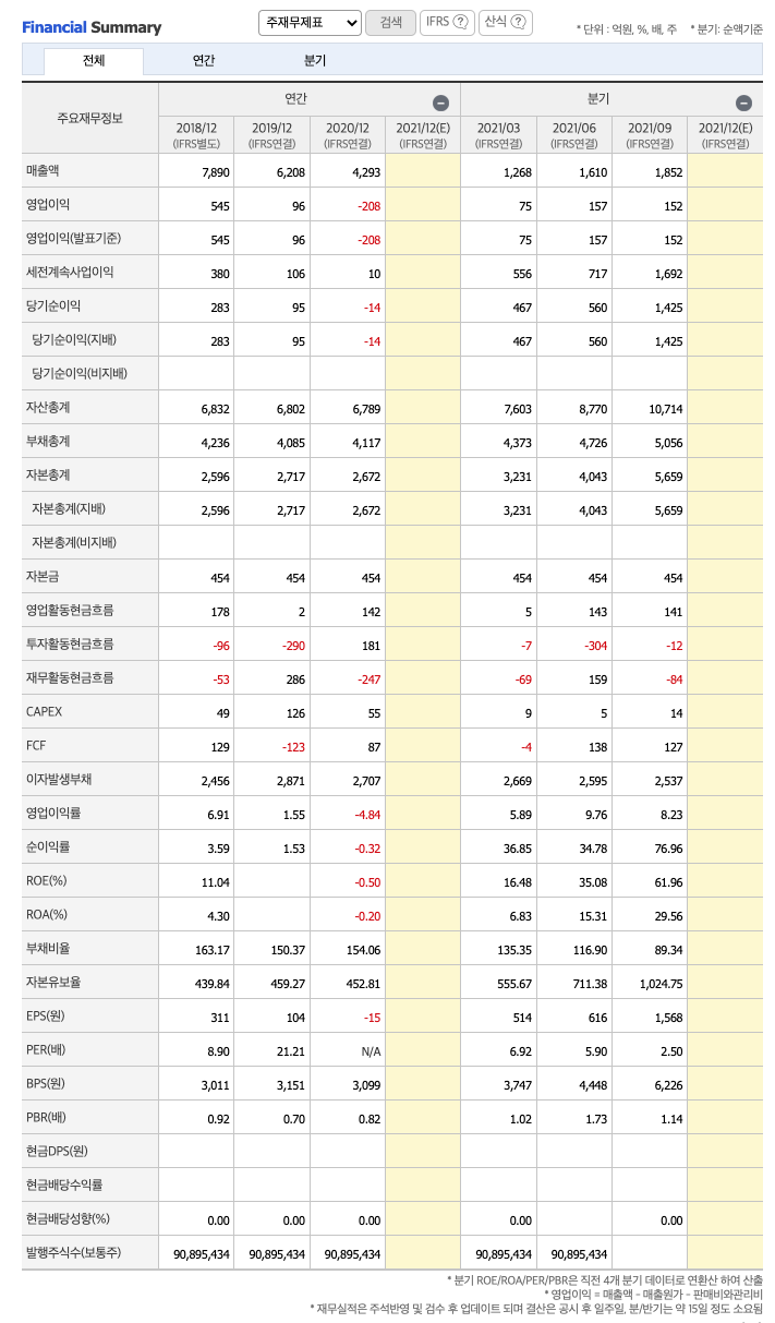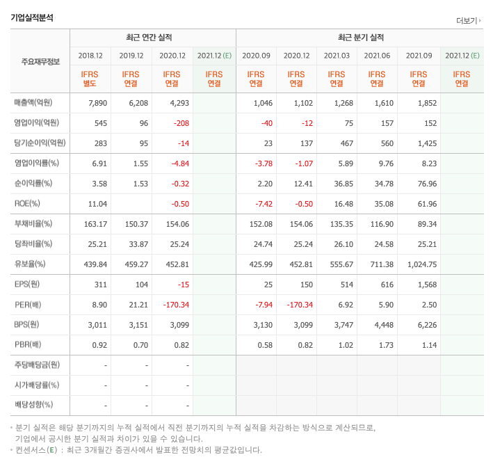 영업이익 : 2018년 545억원, 2019년 96억원, 2020년 -208억원, 2021년 1,2,3분기 384억원으로 전년동기대비 흑자전환하였습니다. 2020년 분기별로 보면 4분기 -12억원, 2021년 1분기 75억원, 2분기 157억원, 3분기 152억원입니다.