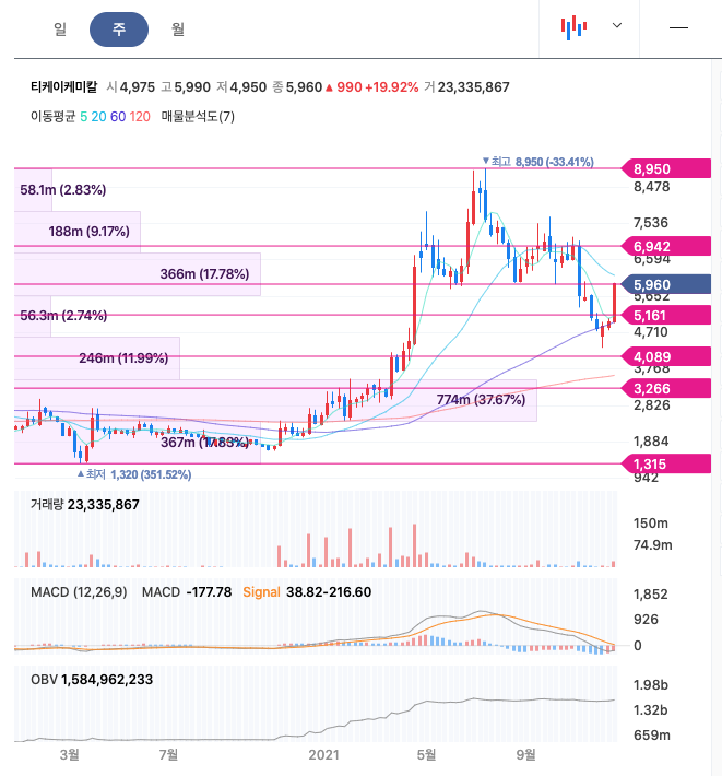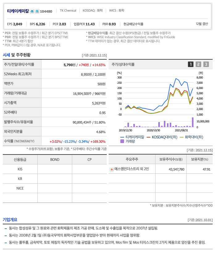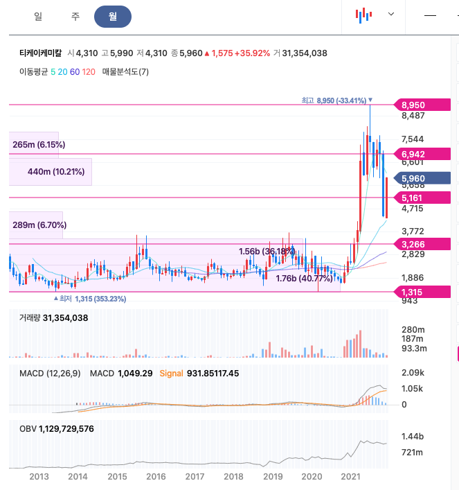 티케이케미칼의 주가는 21년 3월에 반등하여 21년 최고 7월에 8,950원을 찍고 조정을 받았습니다.