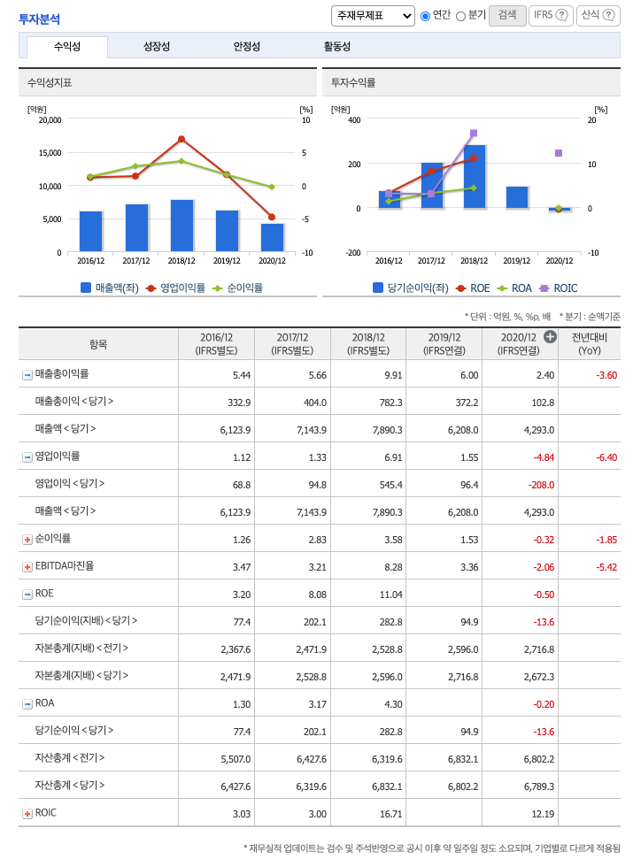 ROE(Return On Equity, 자기자본순이익율, 주주의 관점) : 2016년 약 3%, 2017년 약 8%, 2018년 약 11%, 2020년 약 -0.5%이고, 자기자본순이익율은 이상율(10%)보다 낮습니다.