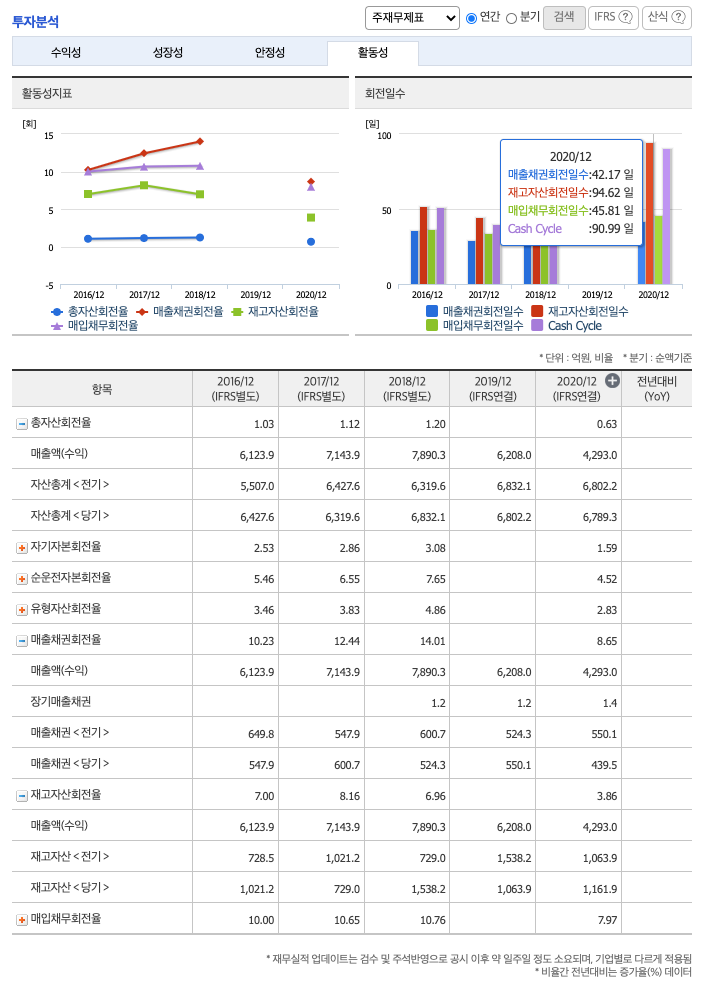 재고자산회전율(높을 수록 좋습니다) : 2018년 약 1538억원, 2019년 약 1063억원, 2020년 약 1161억원이고, 회전율은 2018년 약 6%, 2020년 약 3%로 안정적입니다.
