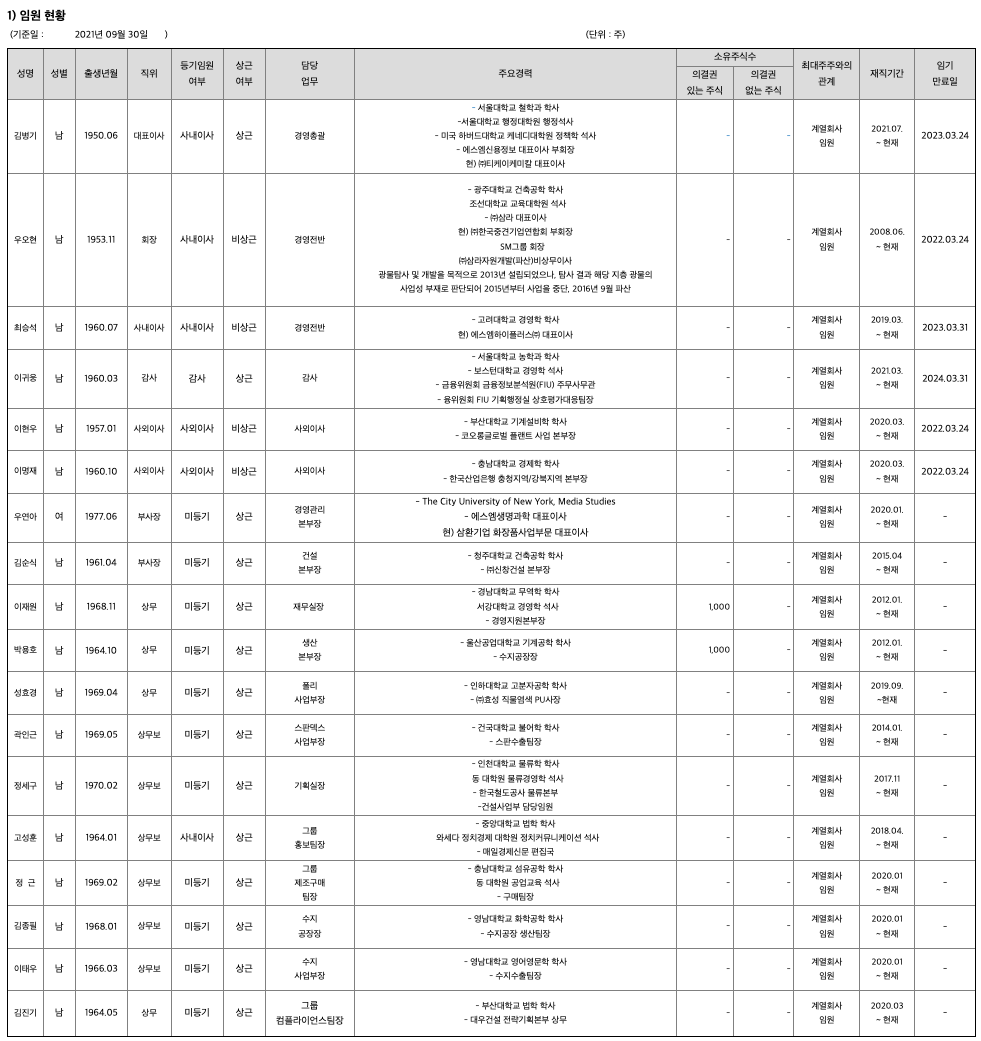 당사는 2007년 합성섬유 및 관련 화학제품을 제조 가공 판매, 도소매 및 수출입을 목적으로 설립되었으며, 2008년 동국무역㈜의 화학사업부문을 영업 양수 받아 현재까지 사업을 영위하고 있습니다. 주요 사업분야로는 화학부문(합성섬유의 제조 및 판매)과 건설부문(주택건설 및 시공) 그리고 전자부문(터치스크린 제조)으로 구성되어 있습니다. 화학부문은 기존 목화나 양모 등의 천연섬유가 담당했던 의류 부분을 화학섬유가 대체하였고, 유리 등의 광물소재가 담당했던 음료용기/식재료 용기 부문에서 플라스틱용기로 대체되고 있습니다. 특히 최근에는 사용분야가 넓어지고 있으며 아웃도어,래쉬가드, 마스크, 레깅스 등 꾸준히 수요가 증가할 것으로 보여집니다. 건설부문은 여타 다른 산업에 비해 생산 및 고용, 부가가치의 창출 효과가 뛰어나기 때문에 국가 경제의 전략적인 산업이기도 합니다. 특히 고객이 평안하게 거주할 수 있는 주거공간을 제공하는데 그 목적이 있으며, 모든 부분을 고려하고 트렌드 변화에민감한 특성을 가지고 있습니다. 전자부문은 주요 제품이 터치스크린으로 국내 주요 전자제품 업체인 삼성전자, LG전자 등에 공급되며, 디스플레이 산업시장(스마트폰, 태블릿PC, 노트북, 자동차, 냉장고 등)에서 수요가 확산되고 있습니다.