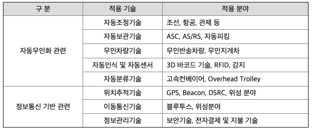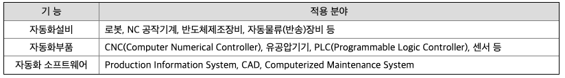 앞서 언급한 바와 같이 일반적인 의미의 자동화시스템 (정보통신기술과 제어시스템을 갖춘 자동화설비) 을 적용 기술별로 분류하면 아래와 같습니다.