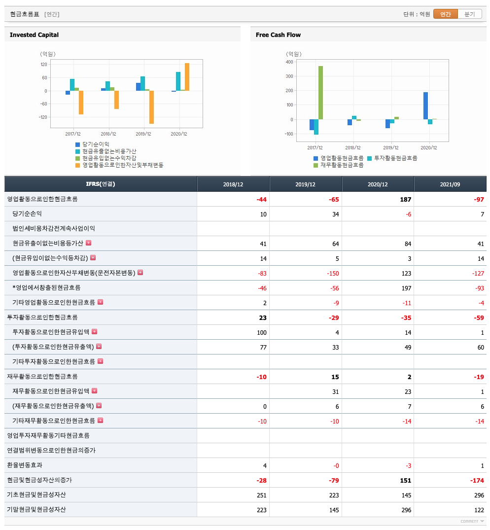 영업활동 현금흐름 : 2018년 -44억원, 2019년 -65억원, 2020년 187억원, 2021년 1,2,3분기 -97억원으로 2020년의 영업활동 현금흐름은 원활합니다.