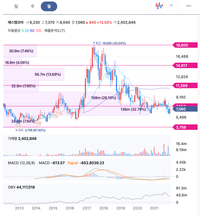 에스엠코어의 주가는 20년 11월에 급등하였고, 21년 1월 최고 9,560원을 찍고 조정을 받고 있습니다.