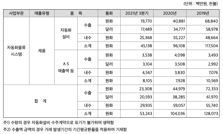 전자상거래와 정보기술의 발달이라는 변화 속에서 지속적인 성장을 위해 노력하는 기업들은 수송의 스피드화, 다국적 기업의 물류거점화, 3D업종에 따른 인력부족 등의 변화요소에 적절히 대응해야 하는 상황에 있습니다. 이들의 변화요소는 고객 서비스의 다양성과 신속성 그리고 관리운영의 효율성을 요구하고 있으며 해결방법의 하나로 원자재의 조달ㆍ생산ㆍ보관ㆍ수송 등의 모든 과정에서의 자동화시스템 구축이 등장하였습니다. 현재 일반적인 의미의 자동화는 정보통신기술과 자동제어시스템을 갖춘 자동화설비를 의미하며 그 적용분야는 조선ㆍ철강ㆍ자동차ㆍ항공ㆍ반도체ㆍIT업종 및 일반제조업 뿐만 아니라 물류ㆍ철도ㆍ항만ㆍ환경 등 그 분야가 광범위하게 퍼져있어 향후 지속적인 발전가능성이 높은 산업입니다. 당사는 1978년 일본 미쓰비시 그룹의 자회사인 료주엔지니어링사와 자동창고 관련 기술제휴를 계기로 자동화물류설비를 생산하기 시작하였습니다. 현재까지 40년이 넘는 기간 동안의 꾸준한 생산 및 연구개발을 통해 당사는 국내에서는 흔하지 않은, 전 자동화물류설비 부문에서의 자체 생산력과 엔지니어링 기술을 확보하고 있는 기업으로 성장하였으며 자동화물류설비 이외에 자동화생산설비 등으로 그 영역을 확대하고 있습니다. 당사가 현재 생산ㆍ공급하고 있는 제품은 공장자동화를 위한 산업설비 자동화시스템으로서 자동차ㆍ화학ㆍ제약ㆍ식품 등의 사업부문을 주요시장으로 하고 있으며 고객의 생산제품과 공정에 맞는 각종 자동화전용기ㆍ자동반송시스템ㆍ로봇 및 응용장비ㆍ자동창고 등을 개발ㆍ공급하고 있습니다.
