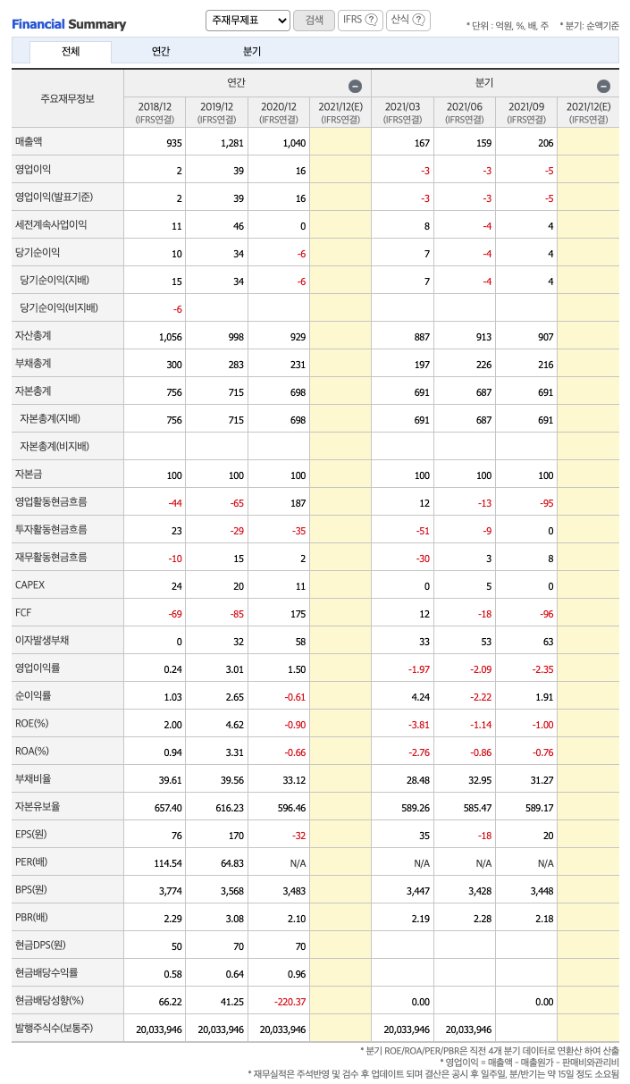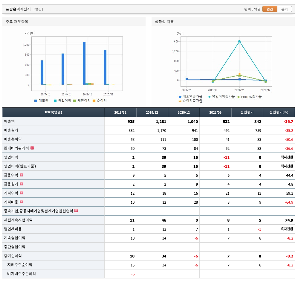 매출액 : 2018년 935억원, 2019년 1281억원, 2020년 1040억원, 2021년 1,2,3분기 532억원으로 전년동기대비 감소하였습니다. 2021년 3분기는 전년동기대비 -36.7% 감소하였습니다. 2020년 분기별로 보면 4분기 199억원, 2021년 1분기 167억원, 2분기 159억원, 3분기 206억원입니다.