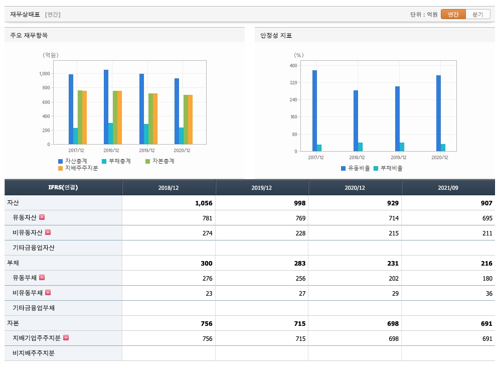 자본은 2018년 756억원, 2019년 715억원, 2020년 698억원, 2021년 1,2,3분기 691억원으로 증가 하였습니다.