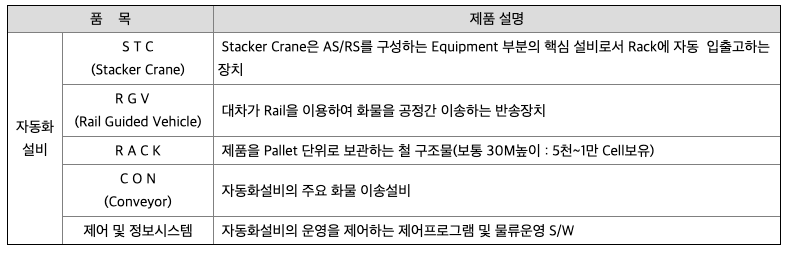 당사는 자동화설비를 구성하는 자동무인화 관련 기술 중 자동보관기술ㆍ무인차량기술ㆍ자동분류기술을 보유하고 있으며 해당 기술을 적용한 자동화설비를 제작ㆍ생산하고 있습니다. 또한 자동화시스템의 기능별 분류는 아래와 같습니다.