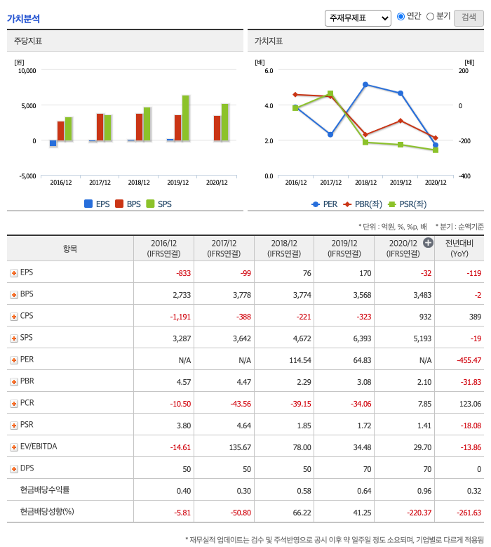 ROE(Return On Equity, 자기자본순이익율, 주주의 관점) : 2016년 약 -26%, 2017년 약 -3%, 2018년 약 2%, 2019년 약 4%, 2020년 약 -0.9%이고, 자기자본순이익율은 이상율(10%)보다 낮습니다.