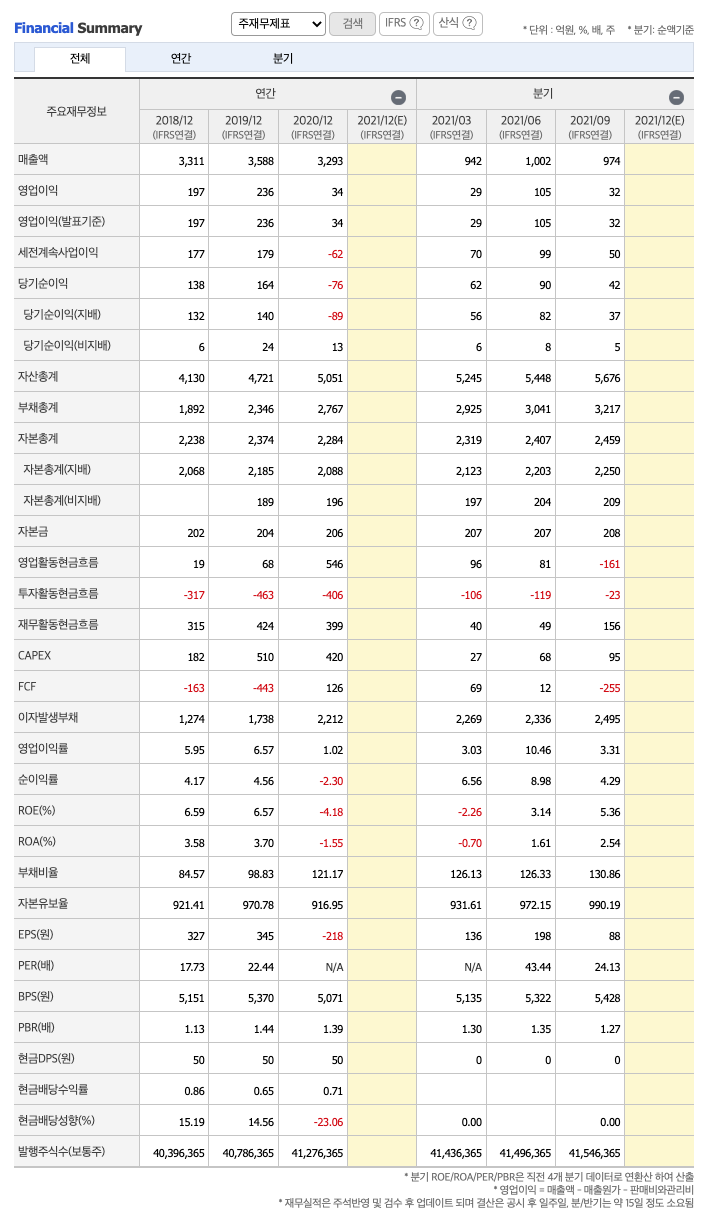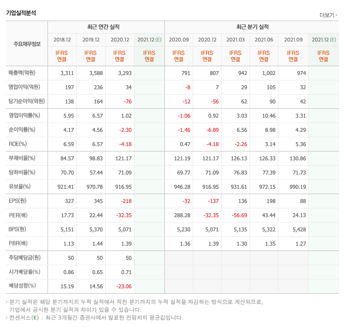 매출액 : 2018년 3311억원, 2019년 3588억원, 2020년 3293억원, 2021년 1,2,3분기 2918억원으로 전년동기대비 증가하였습니다. 2021년 3분기는 전년동기대비 17.4% 증가하였습니다. 2020년 분기별로 보면 4분기 807억원, 2021년 1분기 942억원, 2분기 1002억원, 3분기 974억원입니다.
