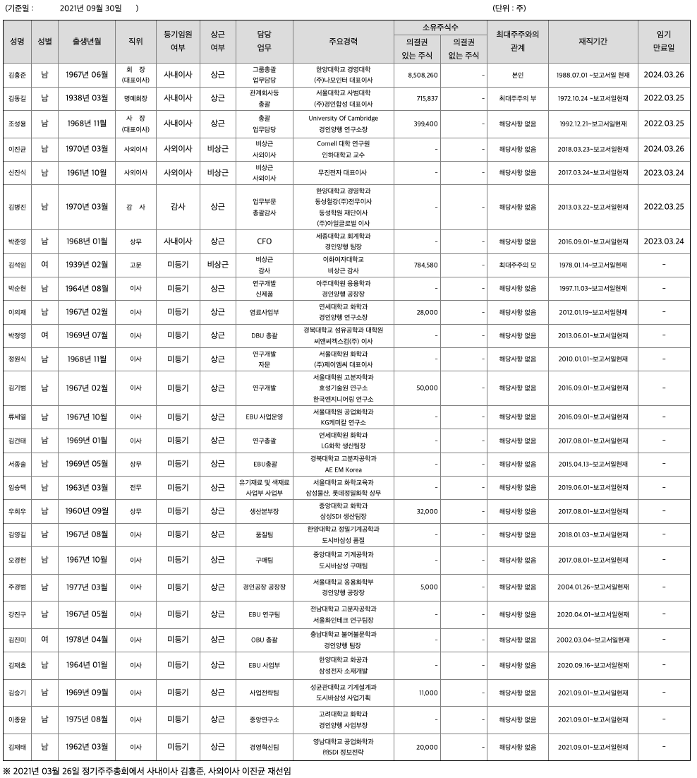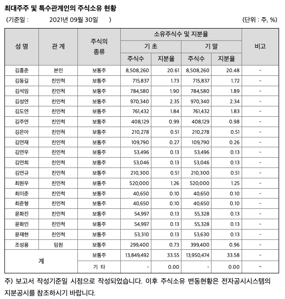 가. 2021년 09월 30일 현재 당사의 최대주주(특수관계인 포함)등의 보유주식수는 13,950,474주이며, 보유비율은 33.58%입니다.