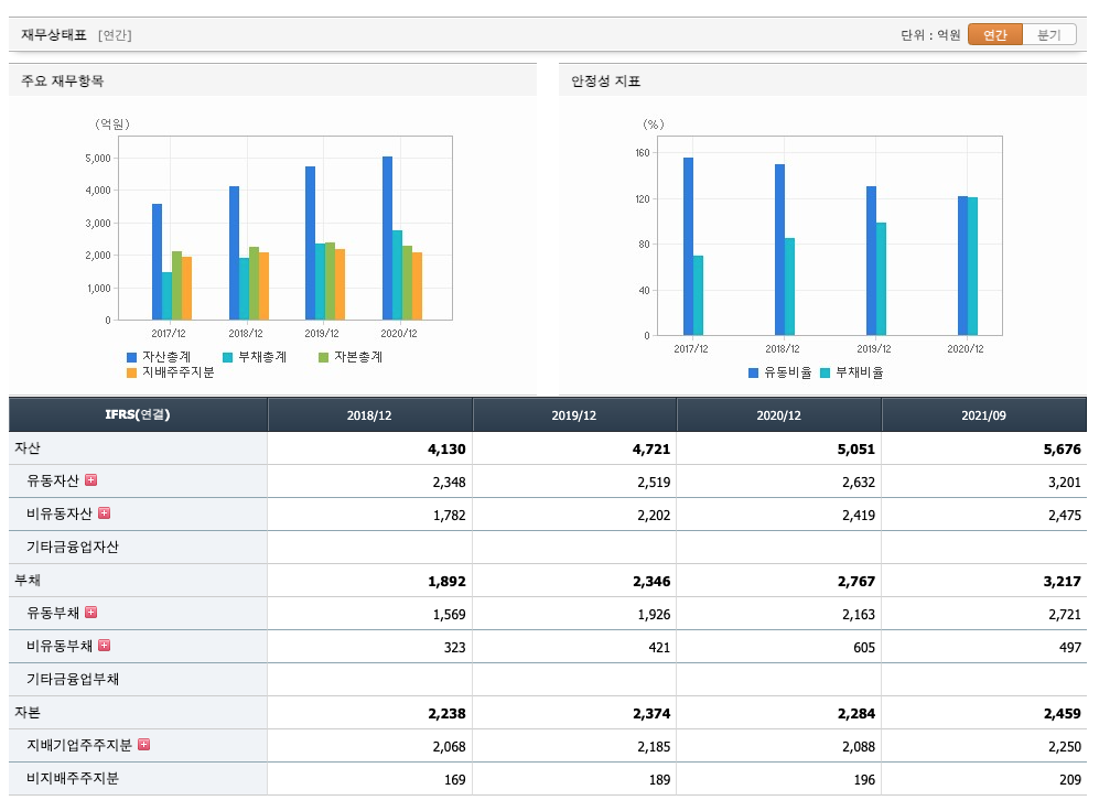 자산은 2018년 4130억원, 2019년 4721억원, 2020년 5051억원, 2021년 1,2,3분기 5676억원으로 증가 하였습니다.